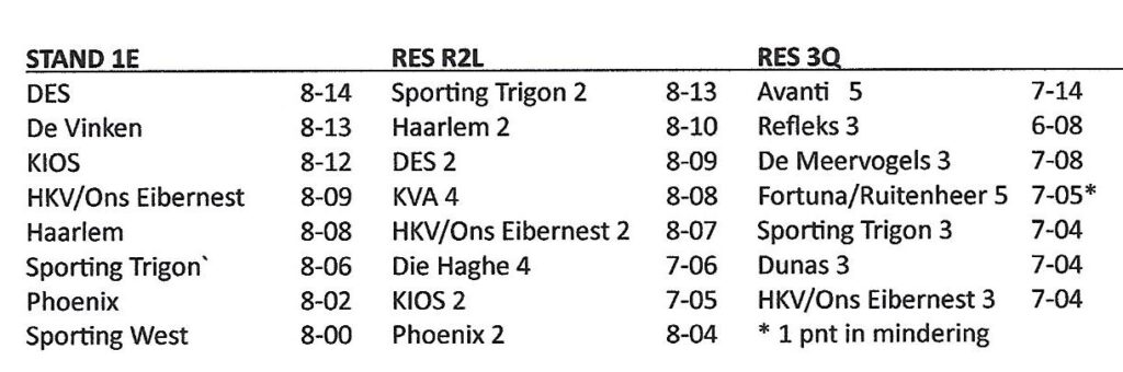 Het eerste weet dus waar het staat en dat is nu op de 6e veilige plek, maar dat is nog allerminst een zekerheidje, zeker nu het puntloze Sporting West het titelkandidaat De Vinken heel erg lastig maakte en met 18-19 nipt verloor. We zullen ons duidelijk moeten verbeteren en dat is een flinke uitdaging, zeker gezien het spel in de laatste twee duels, die in feite kansloos verloren gingen.