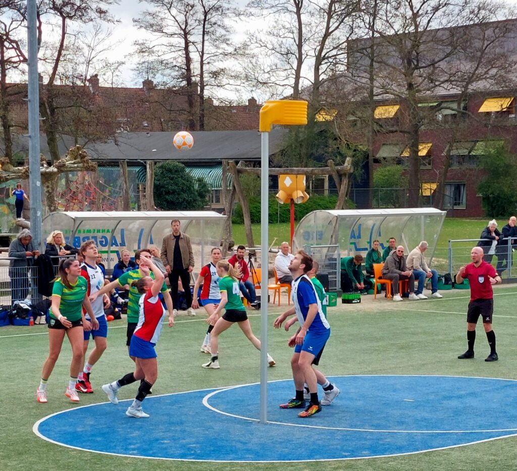 Het bleek een goede opmaat voor het optreden van het eerste dat in HKV/Ons Eibernest meteen een pittige tegenstander trof, waarvan het de laatste 5 duels kortgeleden had verloren. Dat was wel in de zaal en spelen in de buitenlucht bleek toch wat anders. De equipe van de uiteraard trotse Niek was op het begin na constant de overheersende partij en bij het laatste fluitsignaal van de correct leidende Dennis Binnendijk spraken” de cijfers op het scorebord duidelijke taal: 20-12!
