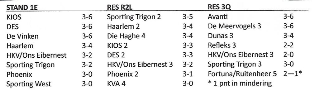 “Geweldig toch”, was de eerste reactie van Niek na afloop van de succesvolle dubbele confrontatie met Haarlem, die voor het eerste de eerste punten opleverde en voor het tweede na 3 wedstrijden de koppositie. Voor de bezoekers waren het de eerste verliespunten. Onze 3 teams scoorden alle 17 goals, wat alleen bij het derde ontoereikend was voor de winst.